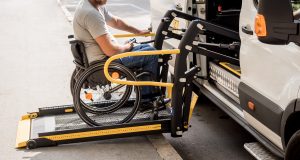 A man in a wheelchair on a lift of a vehicle that uses actuators for people with disabilities.